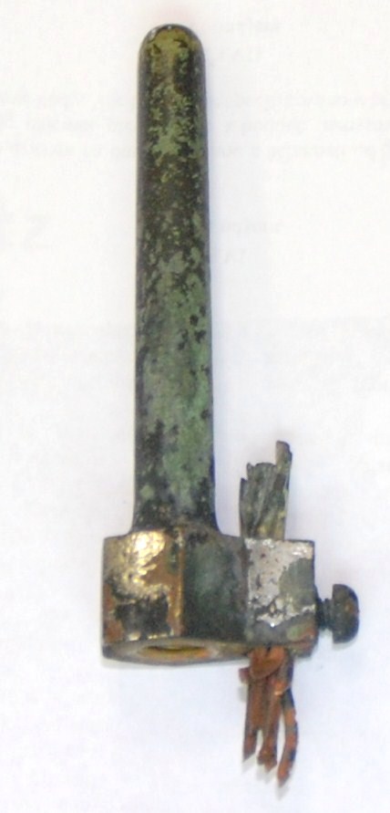 DSC_0003.JPGJímací špička, zřejmě přelom 19/20 století. Materiál mosaz, svod řešený měděným lanem. Daroval Jiří Hamrla Luhačovice |